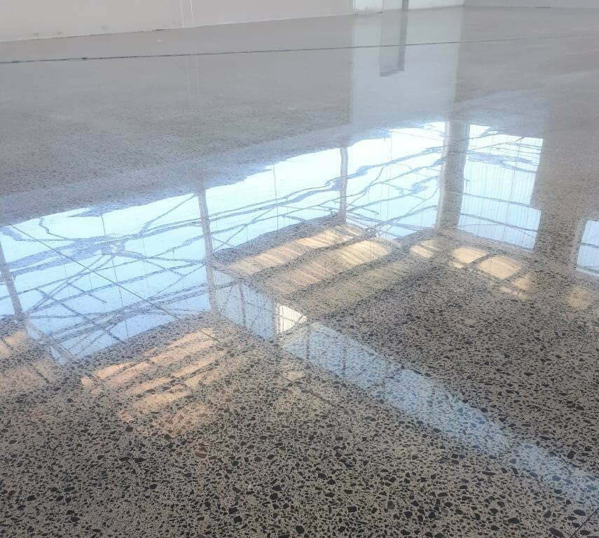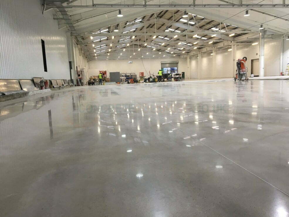 Burnished Concrete is designed for large area flooring surfaces. It looks similar to Polished Concrete, but because it does not go through all the final stages of resin polishing that Polished Concrete does.